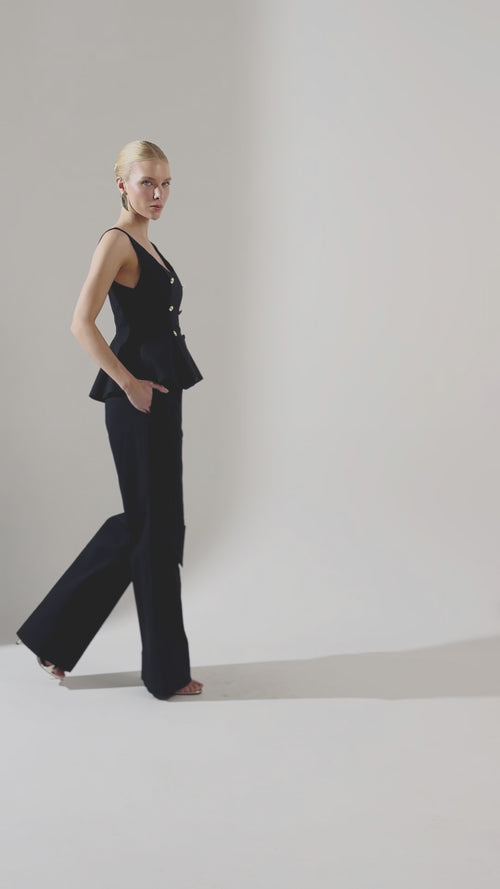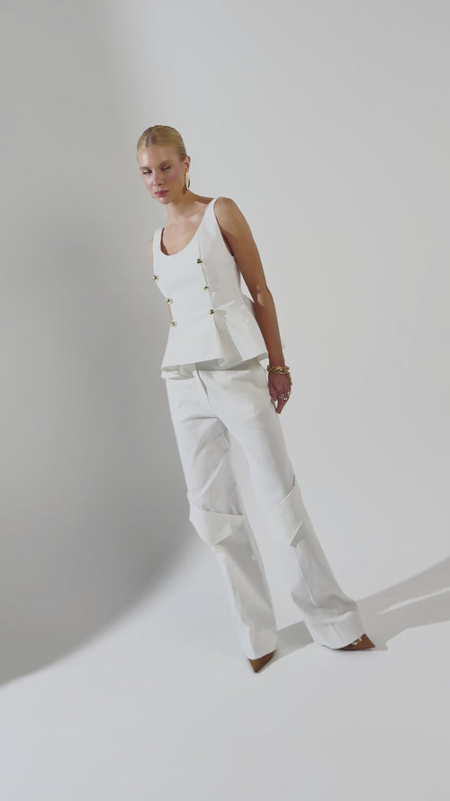 Modelagem reta e cintura alta com bolsos laterais assimétricos, traduzindo um design moderno e sofisticado. A peça tem funcionalidade e estilo, composta por produções originais e versáteis.