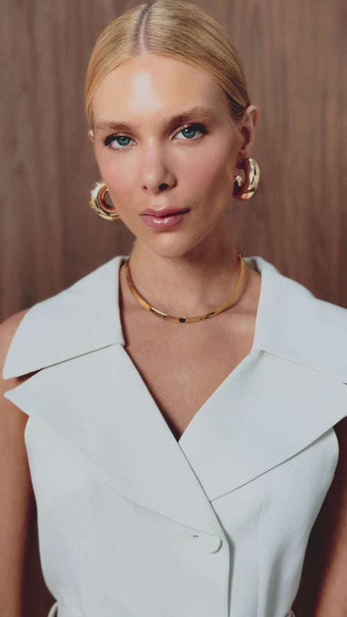 Com modelagem transpassada e gola ampla estruturada, o Blazer sem mangas Angeline tem sofisticação e modernidade. O cinto com ferragem dourada acrescenta estilo e elegância, perfeito para composições versáteis e modernas.