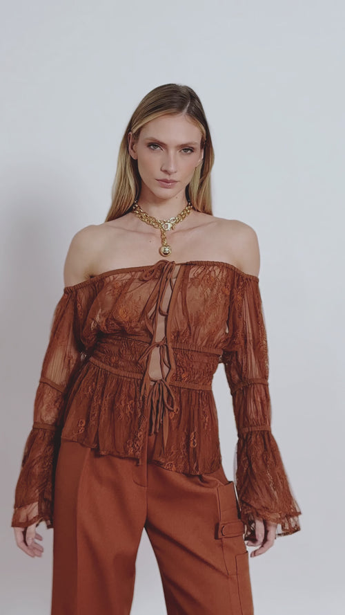 A Blusa Bata Sarah combina fluidez, romantismo e sofisticação. Confeccionada inteiramente em renda, traz transparência na medida certa, com abertura frontal e amarrações que reforçam a delicadeza da modelagem, bem como mangas volumosas que adicionam movimento e elegância. Acompanha top tube para uso por baixo, garantindo conforto e versatilidade sem perder o efeito etéreo da peça.